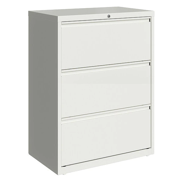 Lateral File Cabinet, File Cabinet Type Lateral, Series HL8000, File Size A4/Legal/Letter, Number of Drawers 3, Number of Doors 0, Overall Width 30 in, Overall Height 40 1/4 in, Overall Depth 18 5/8 in, Finish Powder Coated, Color White, Material Steel, Handle Type Full-Width Drawer Pulls, Label Holder Included Yes, Lock Included Yes, Assembled, Standards ANSI/BIFMA, TAA Compliant, Includes Hang Rails
