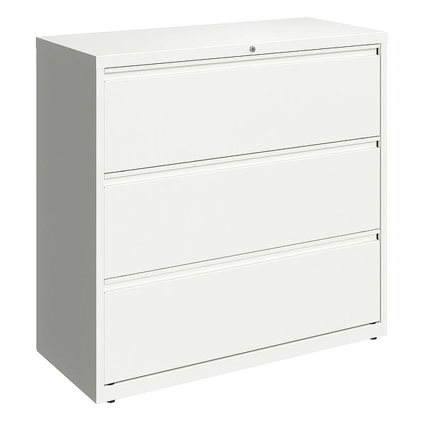 Lateral File Cabinet, File Cabinet Type Lateral, Series HL8000, File Size A4/Legal/Letter, Number of Drawers 3, Number of Doors 0, Overall Width 42 in, Overall Height 40 1/4 in, Overall Depth 18 5/8 in, Finish Powder Coated, Color White, Material Steel, Handle Type Full-Width Drawer Pulls, Label Holder Included Yes, Lock Included Yes, Assembled, Standards ANSI/BIFMA, TAA Compliant, Includes Hang Rails