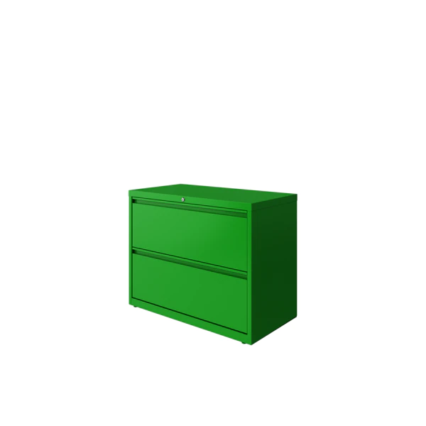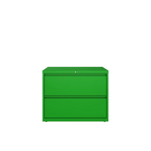 This 36" wide 2 drawer commercial grade lateral filing cabinet is designed for heavy duty use, yet looks great in any office. Precision ball-bearing suspension allows for quiet use in your busy office environment. Fully assembled steel construction with reinforced base. Non-porous surface is easy to clean and disinfect. Interlock system prevents tipping by only allowing one drawer open at a time. Dual lock bars and core-removable lock come standard. Unit includes hang rails, magnetic label holders, and four adjustable leveling glides. Greenguard Gold certified for indoor air quality. Meets or exceeds ANSI/BIFMA standards. TAA compliant.