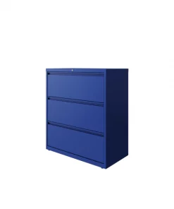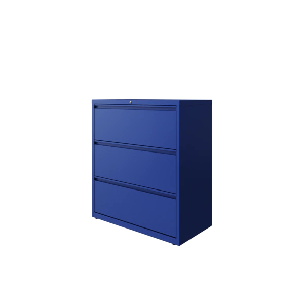 This 36" wide 3 drawer commercial grade lateral filing cabinet is designed for heavy duty use, yet looks great in any office. Precision ball-bearing suspension allows for quiet use in your busy office environment. Fully assembled steel construction with reinforced base. Non-porous surface is easy to clean and disinfect. Interlock system prevents tipping by only allowing one drawer open at a time. Dual lock bars and core-removable lock come standard. Unit includes hang rails, magnetic label holders, and four adjustable leveling glides. Greenguard Gold certified for indoor air quality. Meets or exceeds ANSI/BIFMA standards. TAA compliant.