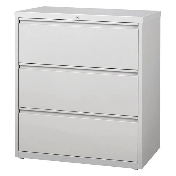 Lateral File Cabinet, File Cabinet Type Lateral, Series HL8000, File Size A4/Legal/Letter, Number of Drawers 3, Number of Doors 0, Overall Width 36 in, Overall Height 40 3/10 in, Overall Depth 18 63/100 in, Finish Powder Coated, Color Light Gray, Material Steel, Handle Type Full-Width Drawer Pulls, Label Holder Included Yes, Lock Included Yes, Assembled, Standards ANSI/BIFMA, Includes Hang Rails