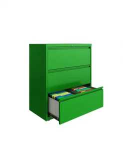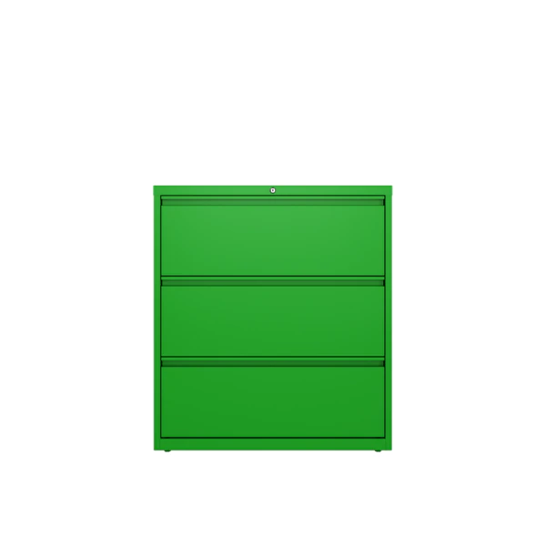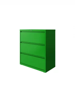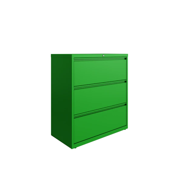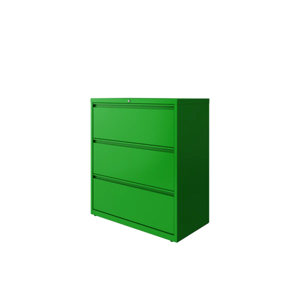 This 36" wide 3 drawer commercial grade lateral filing cabinet is designed for heavy duty use, yet looks great in any office. Precision ball-bearing suspension allows for quiet use in your busy office environment. Fully assembled steel construction with reinforced base. Non-porous surface is easy to clean and disinfect. Interlock system prevents tipping by only allowing one drawer open at a time. Dual lock bars and core-removable lock come standard. Unit includes hang rails, magnetic label holders, and four adjustable leveling glides. Greenguard Gold certified for indoor air quality. Meets or exceeds ANSI/BIFMA standards. TAA compliant.
