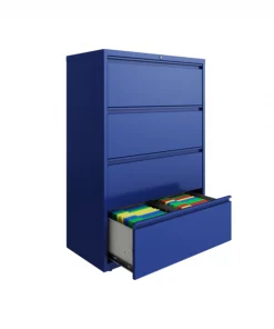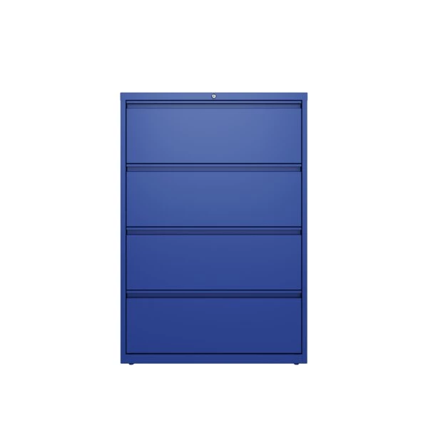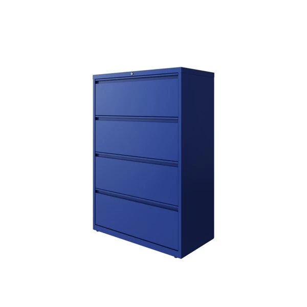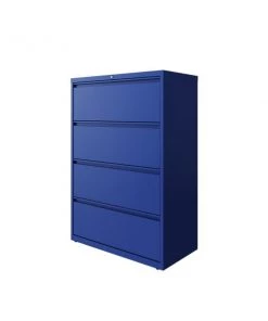 This 36" wide 4 drawer commercial grade lateral filing cabinet is designed for heavy duty use, yet looks great in any office. Precision ball-bearing suspension allows for quiet use in your busy office environment. Fully assembled steel construction with reinforced base. Non-porous surface is easy to clean and disinfect. Interlock system prevents tipping by only allowing one drawer open at a time. Dual lock bars and core-removable lock come standard. Unit includes hang rails, magnetic label holders, and four adjustable leveling glides. Greenguard Gold certified for indoor air quality. Meets or exceeds ANSI/BIFMA standards. TAA compliant.