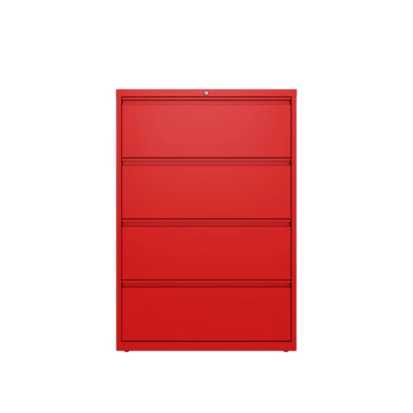 This 36" wide 4 drawer commercial grade lateral filing cabinet is designed for heavy duty use, yet looks great in any office. Precision ball-bearing suspension allows for quiet use in your busy office environment. Fully assembled steel construction with reinforced base. Non-porous surface is easy to clean and disinfect. Interlock system prevents tipping by only allowing one drawer open at a time. Dual lock bars and core-removable lock come standard. Unit includes hang rails, magnetic label holders, and four adjustable leveling glides. Greenguard Gold certified for indoor air quality. Meets or exceeds ANSI/BIFMA standards. TAA compliant.