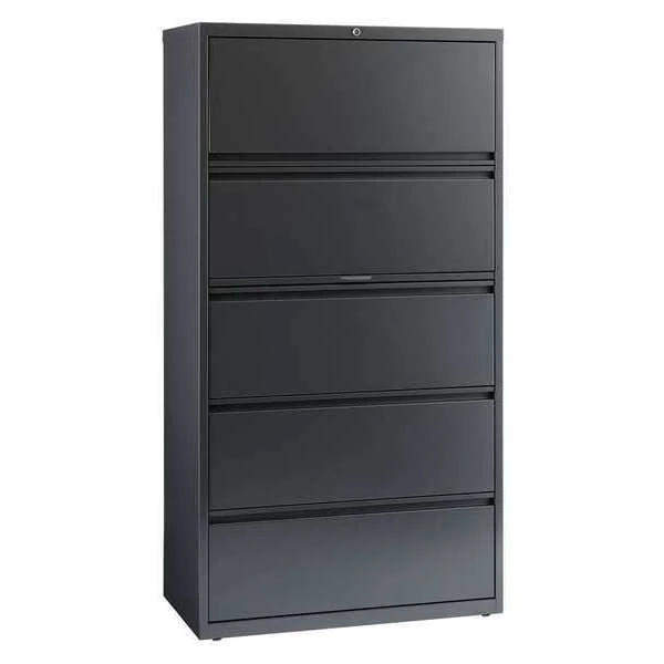 Lateral File Cabinet, File Cabinet Type Lateral, Series HL8000, File Size A4/Legal/Letter, Number of Drawers 5, Number of Doors 0, Overall Width 36 in, Overall Height 67 63/100 in, Overall Depth 18 63/100 in, Finish Powder Coated, Color Charcoal, Material Steel, Handle Type Full-Width Drawer Pulls, Label Holder Included Yes, Lock Included Yes, Assembled, Standards ANSI/BIFMA, Includes Hang Rails, Roll Out Binder Storage