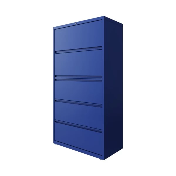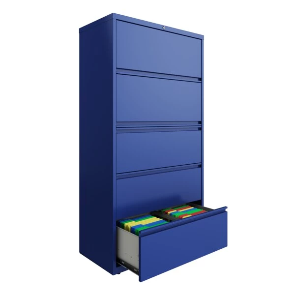This 36" wide 5 drawer commercial grade lateral filing cabinet is designed for heavy duty use, yet looks great in any office. Precision ball-bearing suspension allows for quiet use in your busy office environment. Fully assembled steel construction with reinforced base. Non-porous surface is easy to clean and disinfect. Interlock system prevents tipping by only allowing one drawer open at a time. Dual lock bars and core-removable lock come standard. The top drawer features a roll-out shelf designed to accommodate 3-ring binders. Unit includes hang rails, magnetic label holders, posting shelf, and four adjustable leveling glides. Greenguard Gold certified for indoor air quality. Meets or exceeds ANSI/BIFMA standards. TAA compliant.
