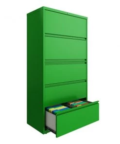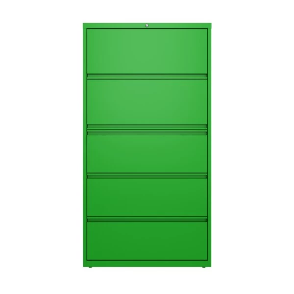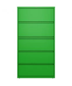 This 36" wide 5 drawer commercial grade lateral filing cabinet is designed for heavy duty use, yet looks great in any office. Precision ball-bearing suspension allows for quiet use in your busy office environment. Fully assembled steel construction with reinforced base. Non-porous surface is easy to clean and disinfect. Interlock system prevents tipping by only allowing one drawer open at a time. Dual lock bars and core-removable lock come standard. The top drawer features a roll-out shelf designed to accommodate 3-ring binders. Unit includes hang rails, magnetic label holders, posting shelf, and four adjustable leveling glides. Greenguard Gold certified for indoor air quality. Meets or exceeds ANSI/BIFMA standards. TAA compliant.