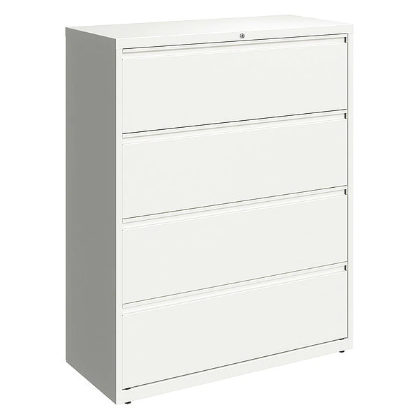 Lateral File Cabinet, File Cabinet Type Lateral, Series HL8000, File Size A4/Legal/Letter, Number of Drawers 4, Number of Doors 0, Overall Width 42 in, Overall Height 52 1/2 in, Overall Depth 18 5/8 in, Finish Powder Coated, Color White, Material Steel, Handle Type Full-Width Drawer Pulls, Label Holder Included Yes, Lock Included Yes, Assembled, Standards ANSI/BIFMA, TAA Compliant, Includes Hang Rails