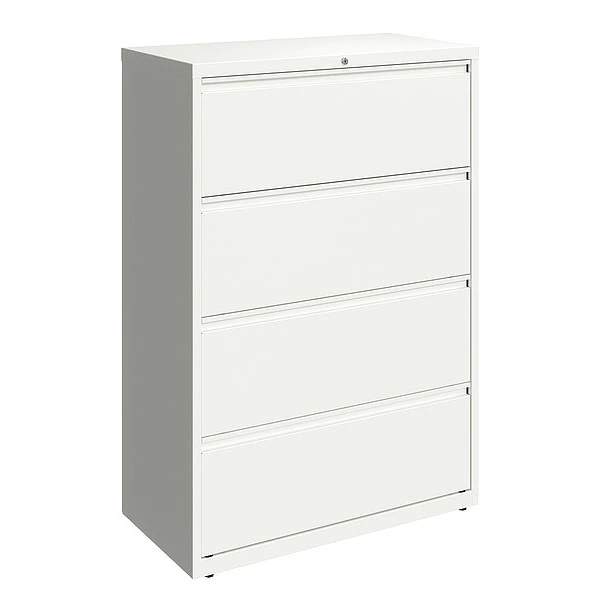 Lateral File Cabinet, File Cabinet Type Lateral, Series HL8000, File Size A4/Legal/Letter, Number of Drawers 4, Number of Doors 0, Overall Width 36 in, Overall Height 52 1/2 in, Overall Depth 18 5/8 in, Finish Powder Coated, Color White, Material Steel, Handle Type Full-Width Drawer Pulls, Label Holder Included Yes, Lock Included Yes, Assembled, Standards ANSI/BIFMA, TAA Compliant, Includes Hang Rails