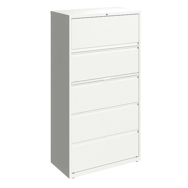 Lateral File Cabinet, File Cabinet Type Lateral, Series HL8000, File Size A4/Legal/Letter, Number of Drawers 5, Number of Doors 0, Overall Width 36 in, Overall Height 67 5/8 in, Overall Depth 18 5/8 in, Finish Powder Coated, Color White, Material Steel, Handle Type Full-Width Drawer Pulls, Label Holder Included Yes, Lock Included Yes, Assembled, Standards ANSI/BIFMA, TAA Compliant, Includes Hang Rails, Roll Out Binder Storage