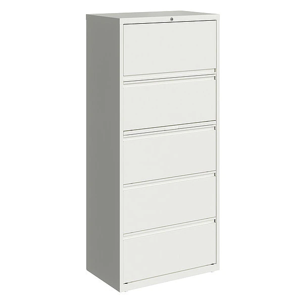 Lateral File Cabinet, File Cabinet Type Lateral, Series HL8000, File Size A4/Legal/Letter, Number of Drawers 5, Number of Doors 0, Overall Width 30 in, Overall Height 67 5/8 in, Overall Depth 18 5/8 in, Finish Powder Coated, Color White, Material Steel, Handle Type Full-Width Drawer Pulls, Label Holder Included Yes, Lock Included Yes, Assembled, Standards ANSI/BIFMA, TAA Compliant, Includes Hang Rails, Roll Out Binder Storage