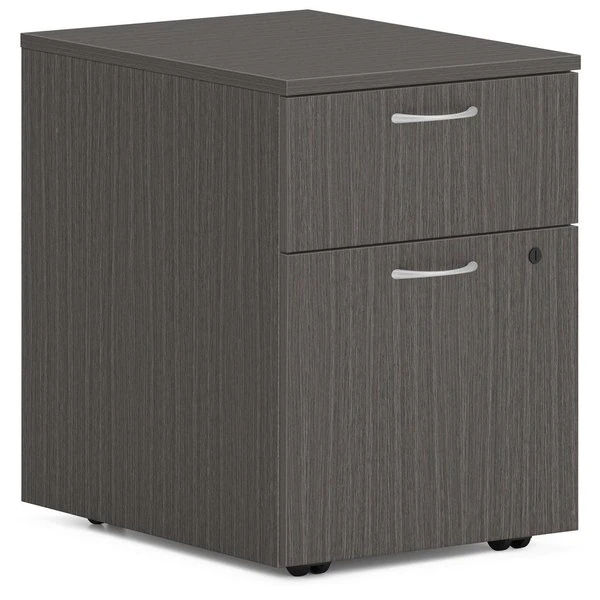 This 15" wide mobile pedestal is part of the HON Mod Desk Collection that delivers simplicity and adaptability to enhance your productivity. The contemporary design feels perfectly at home in either a private office or an open floor plan. Mobile pedestal increases the storage capacity of your Mod workstation. One box drawer holds office supplies and personal items, and one file drawer organizes paperwork. File drawer is equipped with standard hangrails to hold either letter-size or legal-size hanging files. Drawers open fully to give easy access to all contents. Steel ball-bearing drawer suspensions operate easily and quietly. Four durable casters enable easy movement throughout the work space. Durable, Slate Teak laminate is scratch-resistant, spill-resistant and stain-resistant. Slate Teak matches other Mod elements (sold separately) so you can create an office suite to fit your needs.