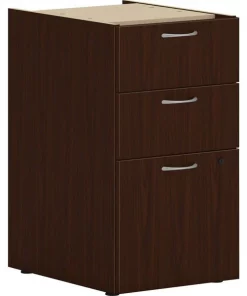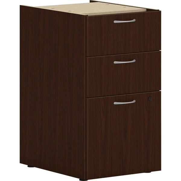 This 15" wide support pedestal is part of the HON Mod Desk Collection that delivers simplicity and adaptability to enhance your productivity. The contemporary design feels perfectly at home in either a private office or an open floor plan. Support pedestal increases the storage capacity of your Mod workstation while also supporting one end of a MOD worksurface. Two box drawers hold office supplies and personal items, and one file drawer organizes paperwork. File drawer is equipped with standard hangrails to hold either letter-size or legal-size hanging files. Drawers open fully to give easy access to all contents. Steel ball-bearing drawer suspensions operate easily and quietly. Durable, Traditional Mahogany laminate is scratch-resistant, spill-resistant and stain-resistant. Traditional Mahogany matches other Mod elements (sold separately) so you can create an office suite to fit your needs.