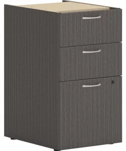 This 15" wide support pedestal is part of the HON Mod Desk Collection that delivers simplicity and adaptability to enhance your productivity. The contemporary design feels perfectly at home in either a private office or an open floor plan. Support pedestal increases the storage capacity of your Mod workstation while also supporting one end of a MOD worksurface. Two box drawers hold office supplies and personal items, and one file drawer organizes paperwork. File drawer is equipped with standard hangrails to hold either letter-size or legal-size hanging files. Drawers open fully to give easy access to all contents. Steel ball-bearing drawer suspensions operate easily and quietly. Durable, Slate Teak laminate is scratch-resistant, spill-resistant and stain-resistant. Slate Teak matches other Mod elements (sold separately) so you can create an office suite to fit your needs.