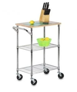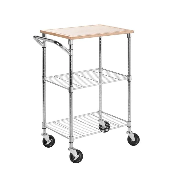 Chrome Kitchen Cart with Cutting Board Chrome/Wood. Brilliant chrome finish and contemporary design makes this unit the perfect blend of good looks and functionality. Its sturdy commercial quality frame has a grid-style thick wire shelves hardwood cu