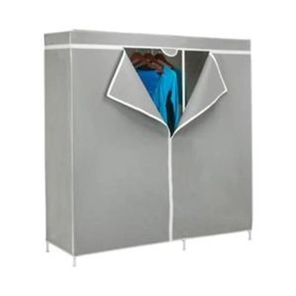 Wardrobe. Gray. This 60- in. wide wardrobe and storage closet provides an amazing value for storing your garments. off-season clothing. and other hanging items. A heavy-duty steel rod provides 60- in. of hanging space while the breathable. lightweight mesh cover completely surrounds your garments. protecting them from dust and damage while in storage. Centered zip closures opens on both sides for easy access. Wardrobe is designed to hold 50 pounds. Some assembly required.
