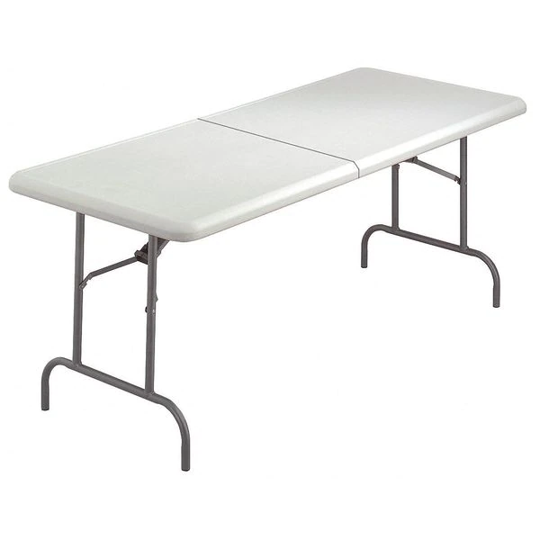 Folding Table, Surface Material Blow Molded Polyethylene, Rectangle, Width 30 in, Length 96 in, Height 29 in, Tabletop Color Family Gray, Tabletop Color Platinum, Frame Color Charcoal, Assembled/Unassembled Assembled, Frame Material Steel, Edge Color Platinum, Edge Type Bullnose, Leg Type Wishbone, Table Material Polyethylene, Top Thickness 2 in, Series IndestrucTable TOO (TM), Load Rating 250 lb, Standards ANSI/BIFMA, Includes Heavy Duty Nonmarring Protective Foot Cap
