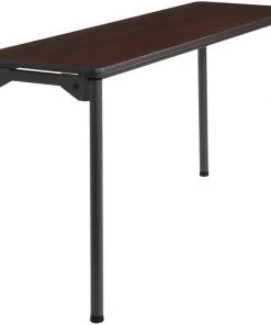 Folding Table, Surface Material Thermal Fused Melamine Laminate, Rectangle, Width 18 in, Length 60 in, Height 30 in, Tabletop Color Family Woodgrain, Tabletop Color Walnut, Frame Color Charcoal, Assembled/Unassembled Assembled, Frame Material Steel, Edge Color Charcoal, Edge Type T-Molded, Leg Type Straight, Table Material Particle Board Substrate, Top Thickness 3/4 in, Series Maxx Legroom(TM), Load Rating 600 lb, Standards ANSI/BIFMA, Includes Heavy Duty Nonmarring Protective Foot Cap