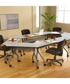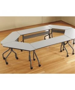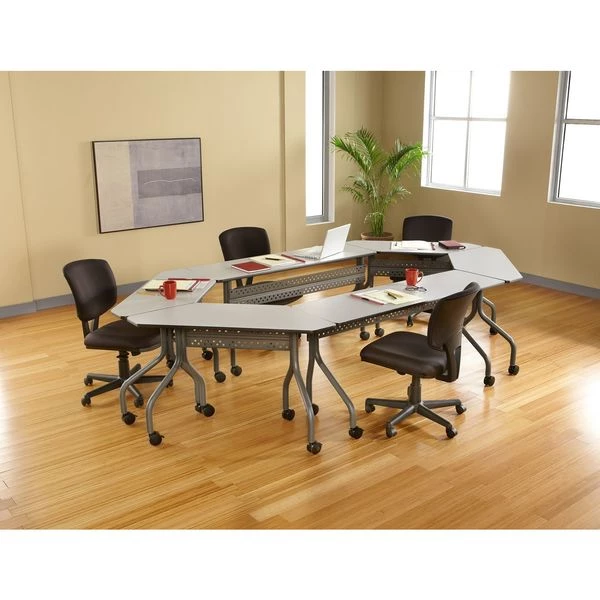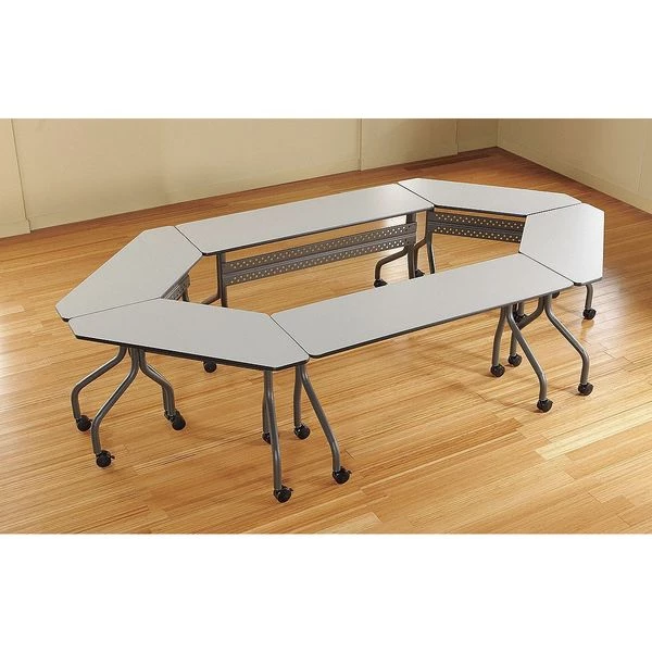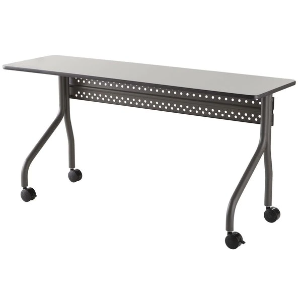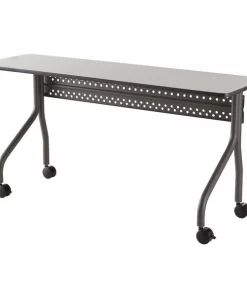 Mobile Seminar Table, Surface Material Thermal Fused Melamine Laminate, Rectangle, Width 60 in, Depth 18 in, Height 29 in, Tabletop Color Family Gray, Tabletop Color Gray, Frame Color Charcoal, Assembled/Unassembled Unassembled, Frame Material Steel, Edge Color Gray, Edge Type T-Molded, Leg Type Offset Dual Legs, Top Thickness 3/4 in, Series OfficeWorks, Load Rating 200 lb, Features (2) Locking and (2) Non-Locking Casters, Perforated Steel Modesty Panel, Standards ANSI/BIFMA