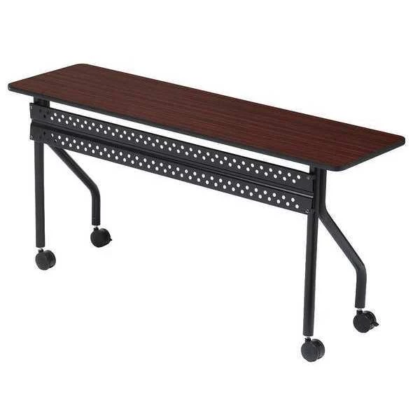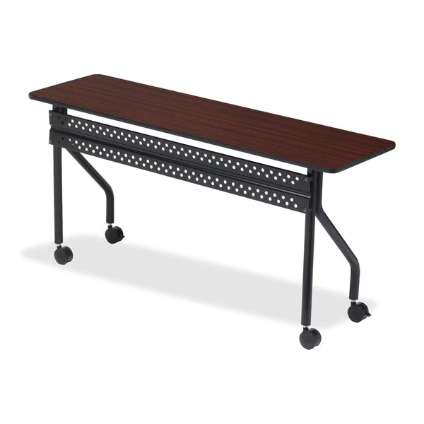 Mobile Seminar Table, Surface Material Thermal Fused Melamine Laminate, Rectangle, Width 60 in, Depth 18 in, Height 29 in, Tabletop Color Family Woodgrain, Tabletop Color Mahogany, Frame Color Black, Assembled/Unassembled Unassembled, Frame Material Steel, Edge Color Gray, Edge Type T-Molded, Leg Type Offset Dual Legs, Top Thickness 3/4 in, Series OfficeWorks, Load Rating 200 lb, Features (2) Locking and (2) Non-Locking Casters, Perforated Steel Modesty Panel, Standards ANSI/BIFMA