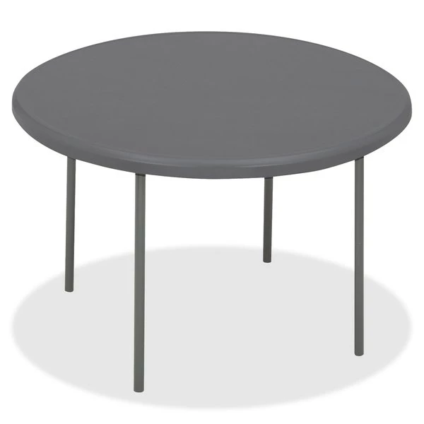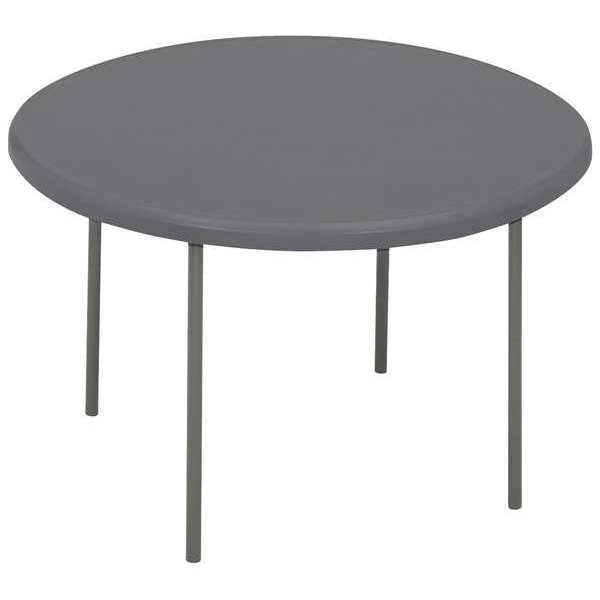 Folding Table, Surface Material Blow Molded Polyethylene, Round, Diameter 60 in, Height 29 in, Tabletop Color Family Gray, Tabletop Color Charcoal, Frame Color Charcoal, Assembled/Unassembled Assembled, Frame Material Steel, Edge Color Charcoal, Edge Type Bullnose, Leg Type Straight, Table Material Polyethylene, Top Thickness 2 in, Series IndestrucTable TOO (TM), Load Rating 250 lb, Standards ANSI/BIFMA, Includes Heavy Duty Nonmarring Protective Foot Cap