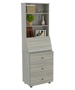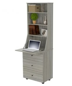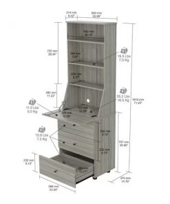 Computer/Credenza Work center by Inval® finished in a rich “Smoke Oak” laminates in durable melamine which is stain, heat and scratch resistant. Constructed from manufactured wood. This unit offers an ample hidden work surface which folds up to change the unit’s look from an office space to a home credenza and blends traditional with classis style. The unit features hidden storage behind the drop down desktop, three (3) large box drawers with metal drawer glides that can accommodate your office supplies and other home storage items. The attached hutch has three (3) shelves and allows you to display books, binders and other decorations to match your home décor. Our unit is equipped with anti-tilt hardware.