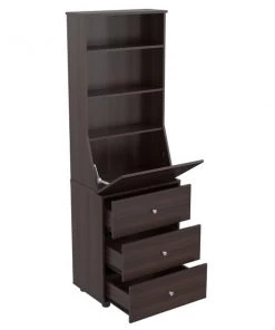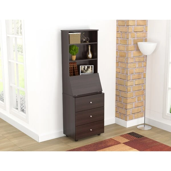 Computer/Credenza Work center by Inval® finished in a rich “Espresso” laminates in durable melamine which is stain, heat and scratch resistant. Constructed from manufactured wood. This unit offers an ample hidden work surface which folds up to change the unit’s look from an office space to a home credenza and blends traditional with classis style. The unit features hidden storage behind the drop down desktop, three (3) large box drawers with metal slides that can accommodate your office supplies and other home storage items. The attached hutch has three (3) shelves and allows you to display books, binders and other decorations to match your home décor.