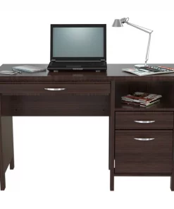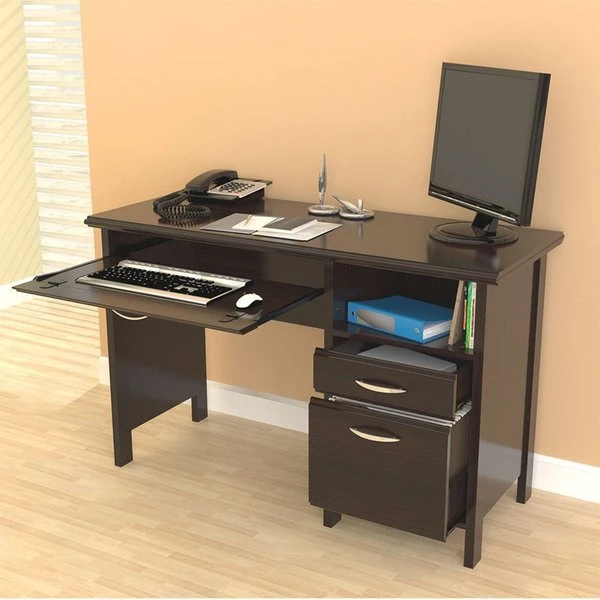 Computer Desk by InvalTM finished in rich "Espresso" laminate. This desk showcases a forty seven inch work surface and is perfect for your home office or office. It features a 1" thick Soft Form top with a laminated modesty panel. It includes a slide-out keyboard tray along with an open storage shelf, one accessory drawer for extra storage and one file drawer will full extension slides that accommodates letter sized files. The desk sits on round plastic gliders which allow for easy mobility when cleaning or rearranging your room decor. Constructed from manufactured wood laminated on both sides with durable melamine which is stain, heat and scratch resistant. Assembly required.