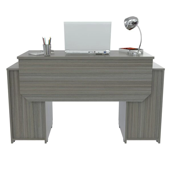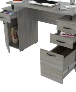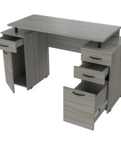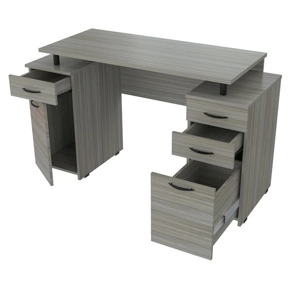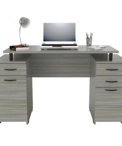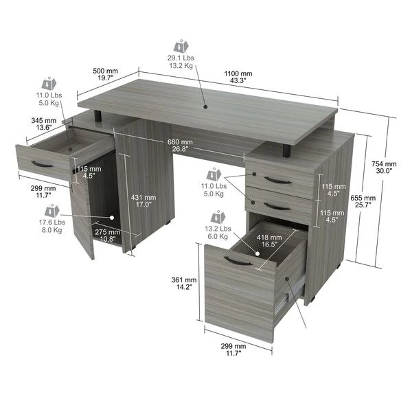 Computer Desk by Inval® finished in a rich “Smoke Oak” laminate. This unit offers a 1” thick work area positioned on top of chrome metal risers. It features 2mm edge banding as well as two pedestals for ample storage. One pedestal has two accessory drawers and one file drawer. The file drawer can accommodate both letter and legal sized files and has full extension slides. The second pedestal has an additional accessory drawer and a storage compartment concealed by a door. Both drawers and door have brushed metal handles, and both pedestals include plastic base gliders to protect the unit when moving it. Constructed from manufactured wood laminated on both sides with durable melamine which is stain, heat and scratch resistant. Assembly required.