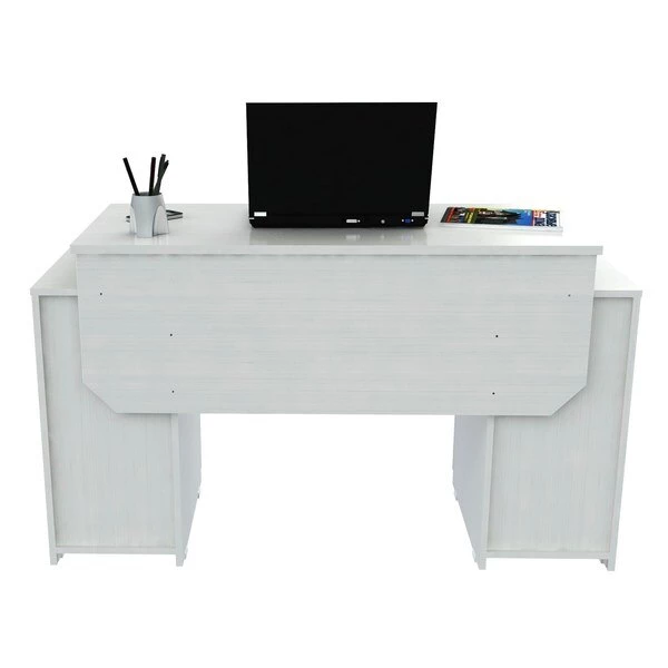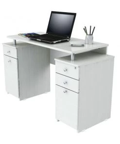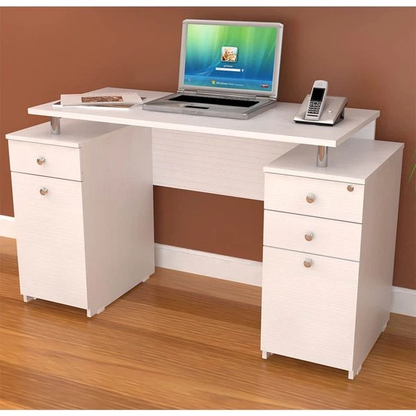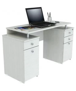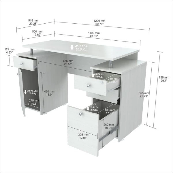 Computer Desk by Inval® finished in a rich “Washed Oak” laminate. This unit offers a 1” thick work area positioned on top of chrome metal risers. It features 2mm edge banding as well as two pedestals for ample storage. One pedestal has two accessory drawers and one file drawer. The file drawer can accommodate both letter and legal sized files and has full extension slides. The second pedestal has an additional accessory drawer and a storage compartment concealed by a door. Both drawers and door have brushed metal handles, and both pedestals include plastic base gliders to protect the unit when moving it. Constructed from manufactured wood laminated on both sides with durable melamine which is stain, heat and scratch resistant. Assembly required.