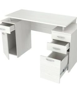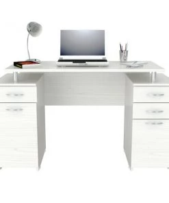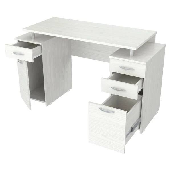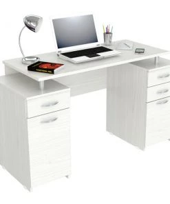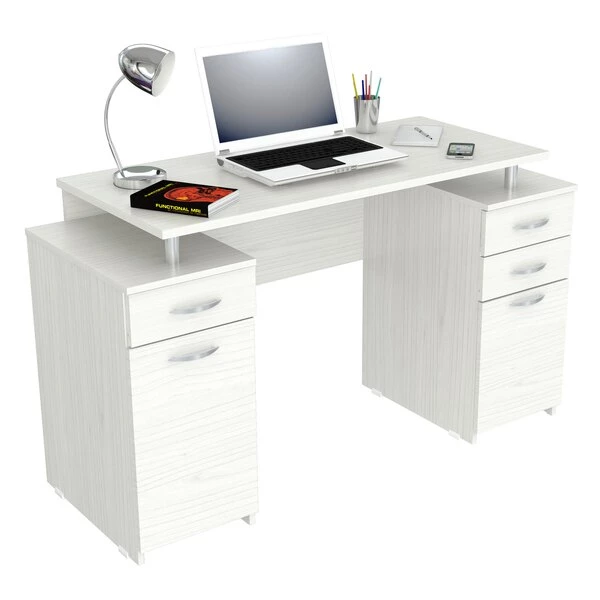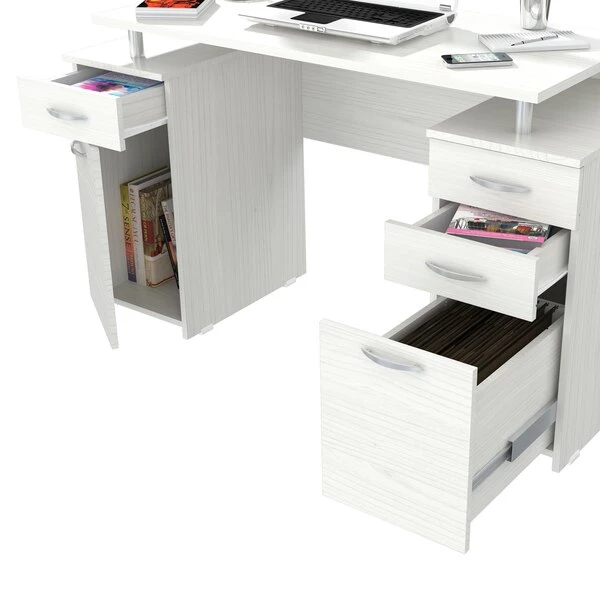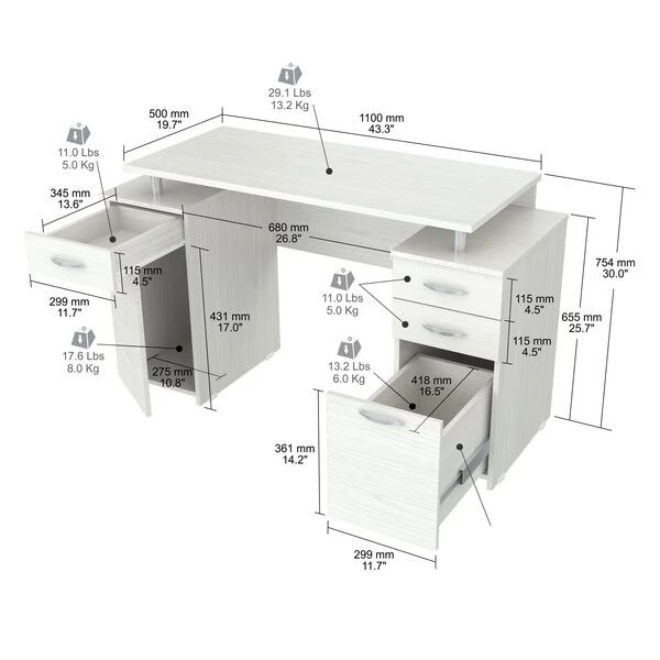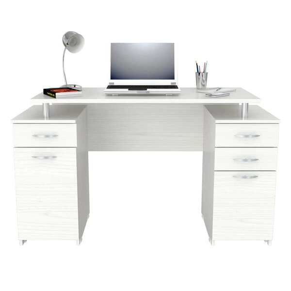 Computer Desk by Inval® finished in a rich “Washed Oak” laminate. This unit offers a 1” thick work area positioned on top of chrome metal risers. It features 2mm edge banding as well as two pedestals for ample storage. One pedestal has two accessory drawers and one file drawer. The file drawer can accommodate both letter and legal sized files and has full extension slides. The second pedestal has an additional accessory drawer and a storage compartment concealed by a door. Both drawers and door have brushed metal handles, and both pedestals include plastic base gliders to protect the unit when moving it. Constructed from manufactured wood laminated on both sides with durable melamine which is stain, heat and scratch resistant. Assembly required.
