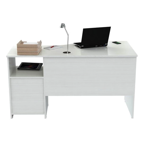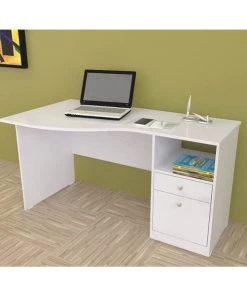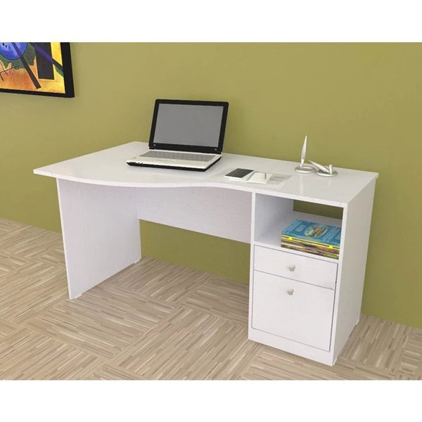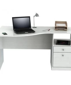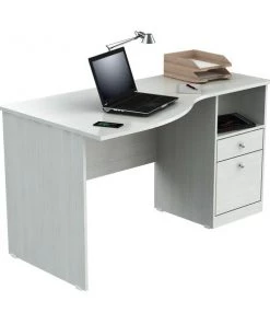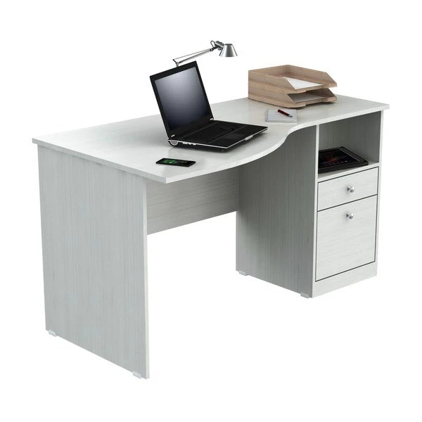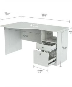 Laura Collection Curved Desk by Inval® finished in a rich “Washed Oak” laminates in durable melamine which is stain, heat and scratch resistant. Constructed from manufactured wood. This desk features a large curved top providing a spacious work surface which will create a perfect addition to your home office or office. It includes a laminated modesty panel, open storage shelf, one accessory drawer with slides, and one file drawer both with brushed metal handles. The file drawer has full extension slides which accommodates letter sized files. Square plastic sliders protect the unit and allow for easy mobility when cleaning or rearranging your room décor.