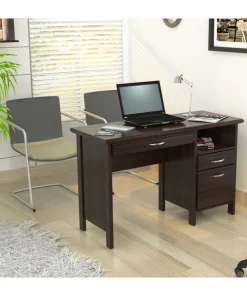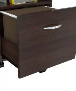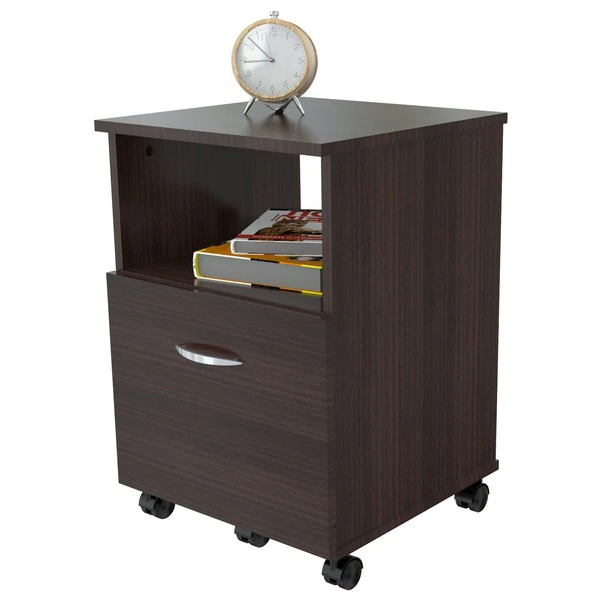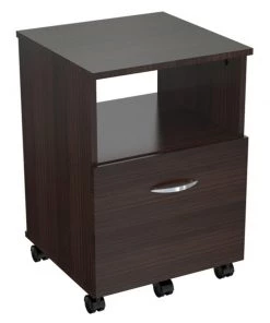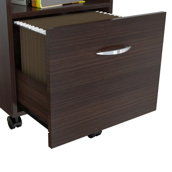 UfficiTM File Cabinet Collection by Inval® finished in a rich “Espresso” laminates in durable melamine which is stain, heat and scratch resistant. Constructed from manufactured wood. This commercial grade vertical mobile unit has a functional modern design that is an excellent choice for your home office or office. It features a 1mm edge banding on the front edge of the file, drawer’s front panel and top. The unit includes open storage allowing room for organizing books and accessories, one file drawer with a brushed metal handle and brushed metal rails which accommodate letter sized files. It has five 2" casters for easy mobility which also lock when needed for added safety.