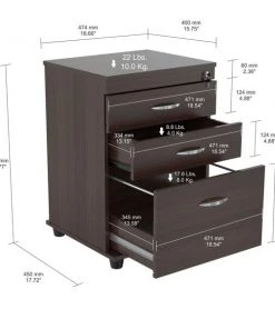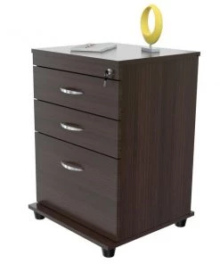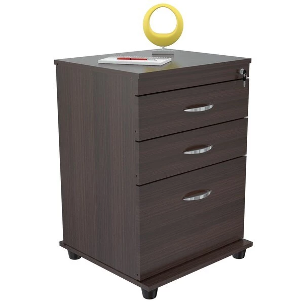 UfficiTM File Cabinet Collection by Inval® finished in a rich “Espresso” laminates in durable melamine which is stain, heat and scratch resistant. Constructed from manufactured wood. This commercial grade vertical mobile unit has a functional modern design that is an excellent choice for your home office or office. The front edge of the file and drawer front panels have 1mm edge banding. The unit features two accessory drawers and one file drawer that accommodates both letter or legal sized files, and has full extension slides. All drawers have brushed metal handles and a locking mechanism for added security. It rests on four gliders for added stability.