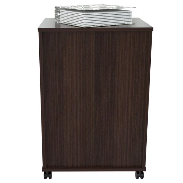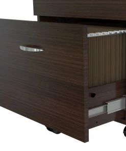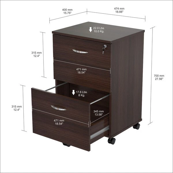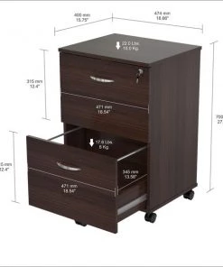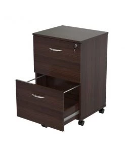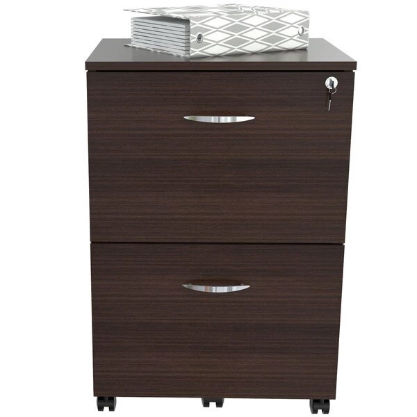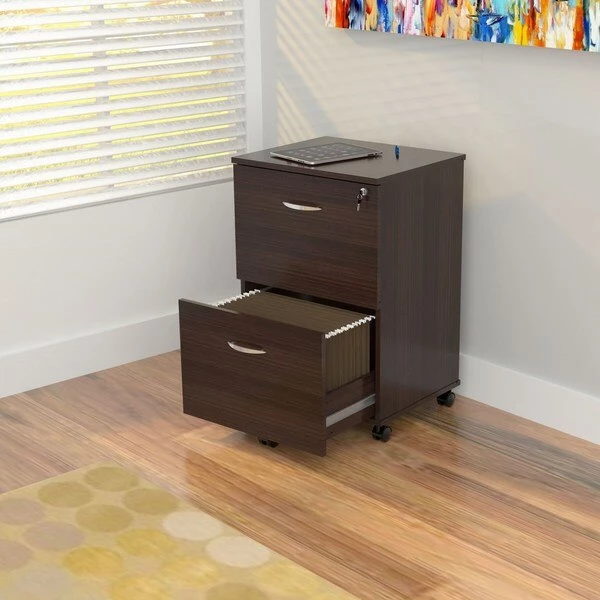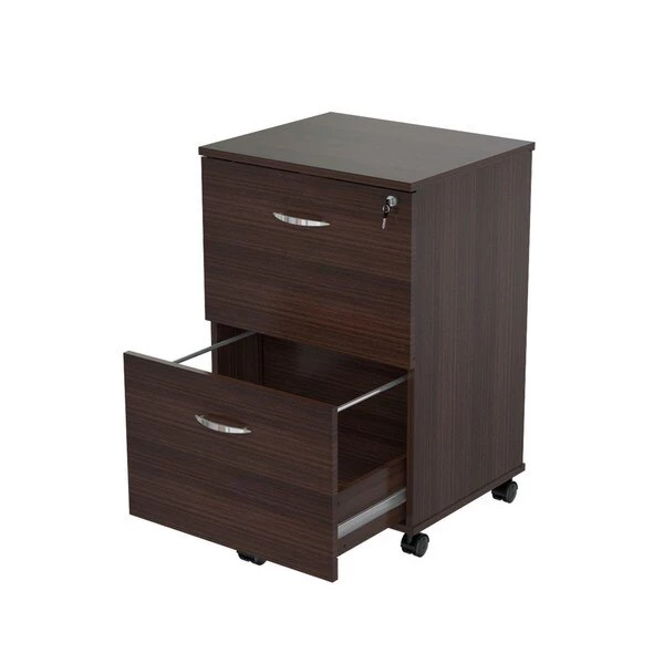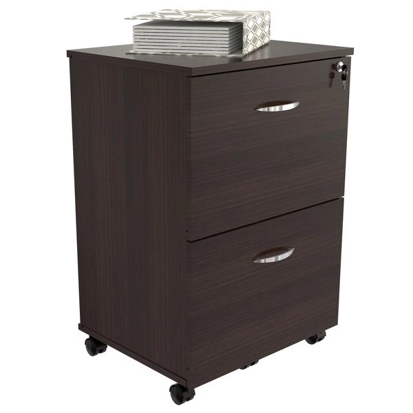 UfficiTM File Cabinet Collection by Inval® finished in a rich “Espresso” laminates in durable melamine which is stain, heat and scratch resistant. Constructed from manufactured wood. This commercial grade vertical mobile unit has a functional modern design that is an excellent choice for your home office or office. It features two drawers that can accommodate for both letter or legal sized files, full extension slides and the top drawers has a locking mechanism for added security. Both drawers have brushed metal handles and include five 2" locking casters for security and mobility..