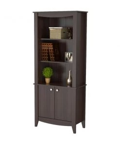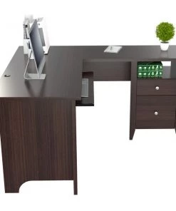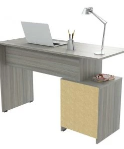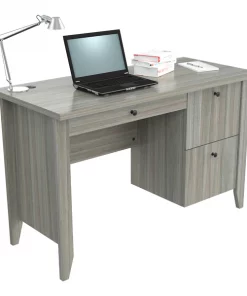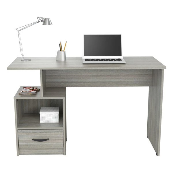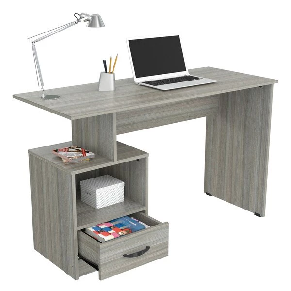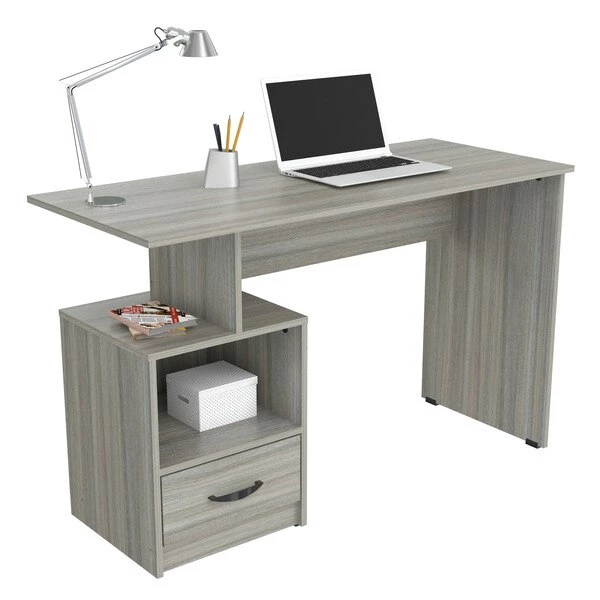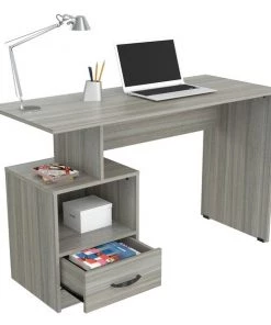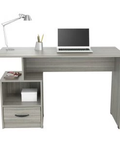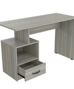 INVAL multi level writing desk finished in a rich “Smoke Oak” laminates in durable melamine which is stain, heat and scratch resistant and is constructed from manufactured wood. This units has a modern isometrically design suitable for placement in various room settings. It features an ample long desktop work surface to accommodate your laptop or tablet and other office accessories. It also includes shelf space for various office essentials like a printer platform as well as a glide drawer with metal rails to conceal stored items. Chair, laptop and decorative accessories are not included or available through Inval. Assembly required.