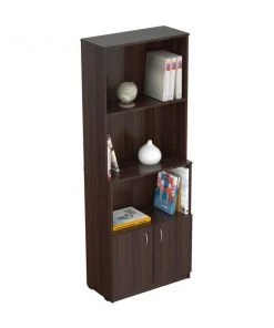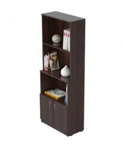 Bookcase by Inval® finished in a rich “Espresso” laminates in durable melamine which is stain, heat and scratch resistant. Constructed from manufactured wood. The unit has a functional modern design that is an excellent choice for your home office or office. The bookcase features three shelves, one being adjustable to accommodate books and accessories, as well as a concealed storage compartment that has two doors with brushed metal handles.
