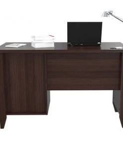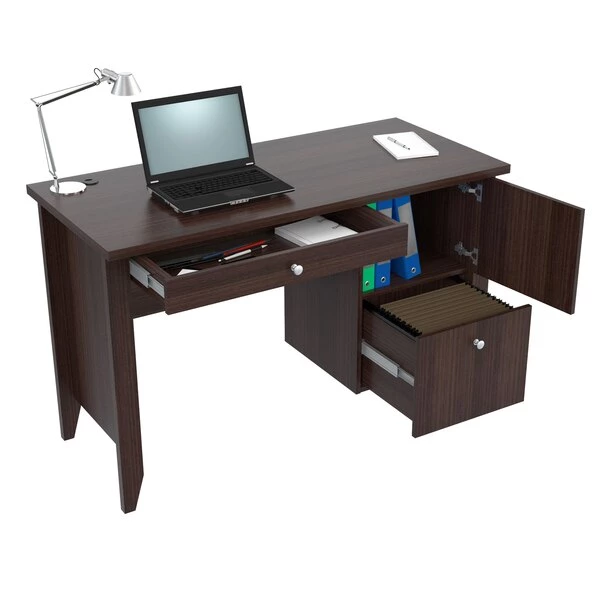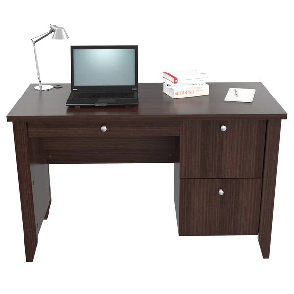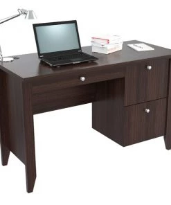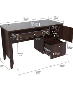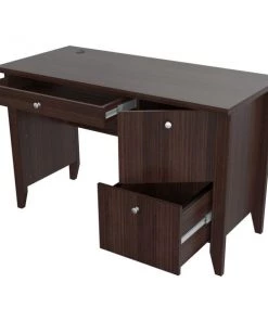 Bradford Writing Desk Collection by Inval® finished in a rich “Espresso” laminates in durable melamine which is stain, heat and scratch resistant. Constructed from manufactured wood. This unit offers a blend of simplicity and versatility. The computer table has a simple yet steady construction that adds to its dependability. The contemporary style of the table blends in with most room decors. This computer desk features a 2mm commercial grade edge banding. The desk features a 47” (120cm) work surface ideal for your laptop, tablets and your daily paper work. It also includes a bottom drawer with full metal extension slides that can accommodate letter sized hanging files, a top storage area with a door mounted with concealed euro hinges and a center pencil drawer to house your pens, notepads and other office essentials. The desk has a double laminated modesty panel with cable management passthrough.