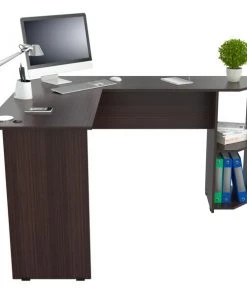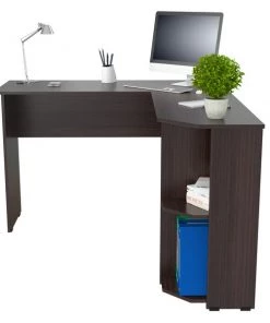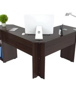 Merlin L Shaped Work Center by Inval® finished in a rich “Espresso” laminates in durable melamine which is stain, heat and scratch resistant. Constructed from manufactured wood. With large dual desktops, you have an abundance of room on which to place your laptop, tablet, documents, office supplies and any other décor to add a personal touch. The desk is equipped with a cable management pass-through to keep all cords organized. The design without center obstacles makes it simple to move from side to side enabling you to work in an effortlessly manner. Both the laminates and design make it ideal for staging and decorating your home office or office.