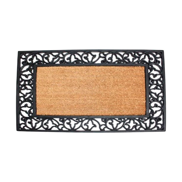 Rugged nonslip black rubber outdoor edged mat has a made from the highest quality all natural coconut fiber that will catch dirt and debris to get shoes clean. This mat is also hand stenciled with permanent fade-resistant dyes.