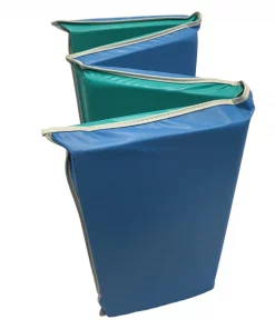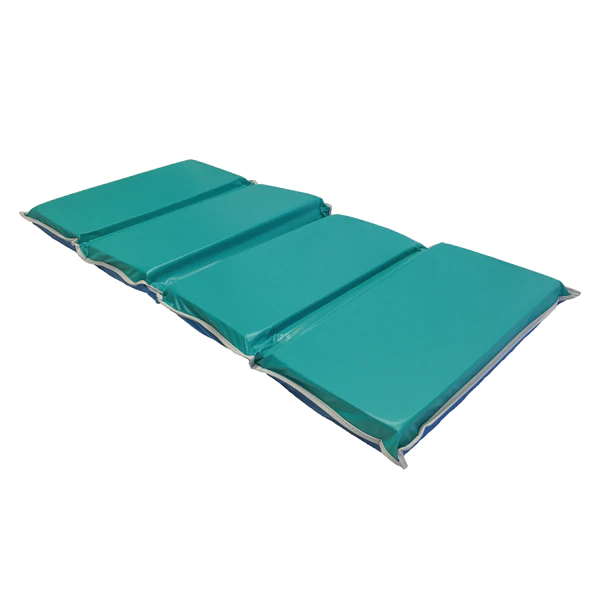 KinderMats Jr. Daydreamer rest mat is great if you are looking for a little more cushion for your kids. 44" x 19" and 2" thick. Blue on one side, teal on the other, makes it easy to assign a side to put on the floor and a side to lay on. The tough 9 mil vinyl is water resistant and easy to clean as well as disinfect, simply wipe with warm soapy water. This mat is the perfect option for school, daycare, or home. Easy to store in a cubby or on the go with the tri-fold four section measuring to 8" x 11" x 19". An added touch to this mat, the gray binding provides extra strength and durability on the edges.