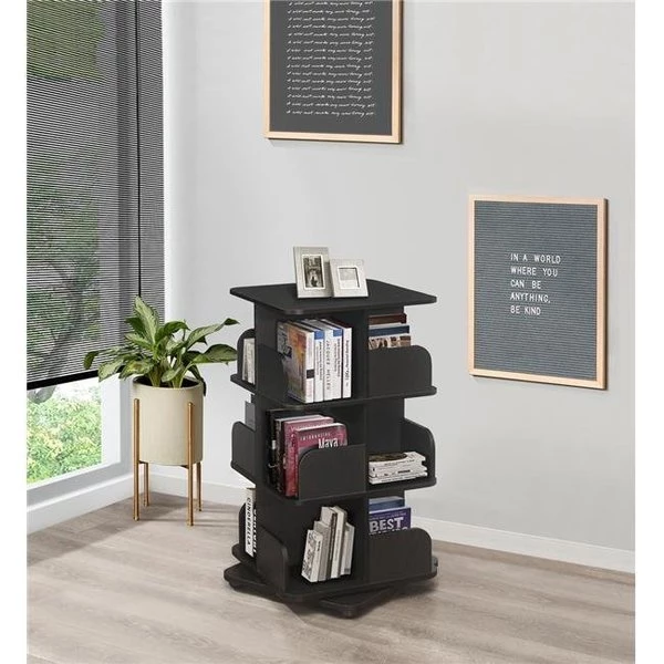 The Angelica Bookcase is perfect for offices. kid's rooms and living rooms with a revolving design. Each tier features four compartments and the stylish wood construction is sure to impress. SpecificationsCollection Name: AngelicaMaterials: Laminated WoodFinish: BlackDimension: 18"W x 18"D x 32"HWeight: 46 lbs