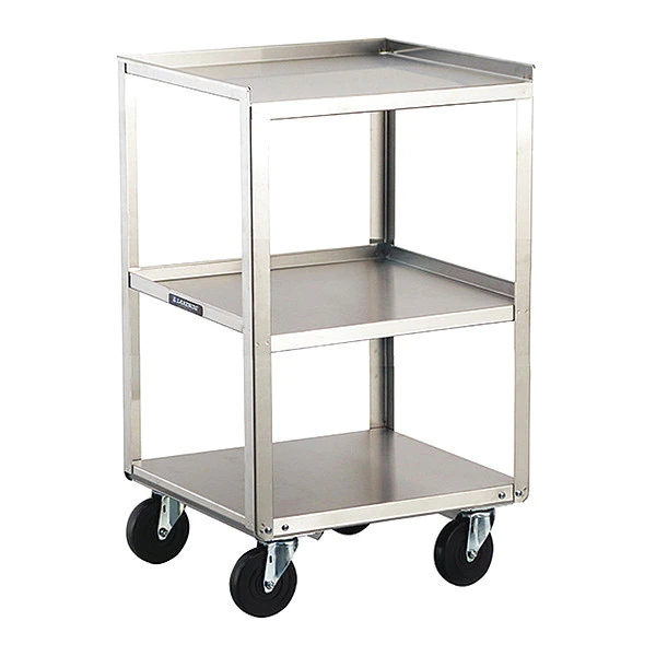 Corrosion-Resistant Mobile Medical Equipment Stand, Assembled/Unassembled Assembled, Material Stainless Steel, Load Capacity 500 lb, Caster Wheel Dia. 4 in, Caster Wheel/Tread Material Polyurethane, Caster/Wheel Configuration (4) Swivel, Caster Brake Type No Brake Included, Cabinet Color Silver, Drawer Color No Drawers, Number of Drawers 0, Number of Shelves 3, Shelf Length 18 3/4 in, Shelf Width 16 3/4 in