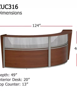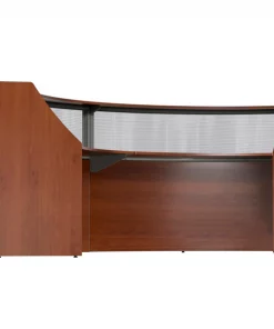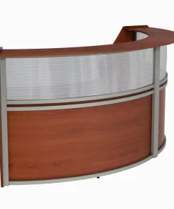 Linea Italia Curved Modern Reception Desk with Counter, 2 Units, Clear Panel that allows ligth into desk area. Dimensions: 124”W x 49”D x 46”H and 13"D in top counter and 20"D inside table. Strong metal frame and laminated wood body in Cherry finish. Reception Station modern design for Lobby, Salon, Office, Secretary, Receptionist. Easy to Assembly, no tools required, leveling glides for uneven flooring. Expertly shrink wrapped and packed to avoid damage during transit.