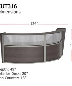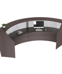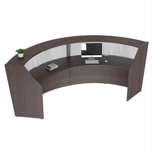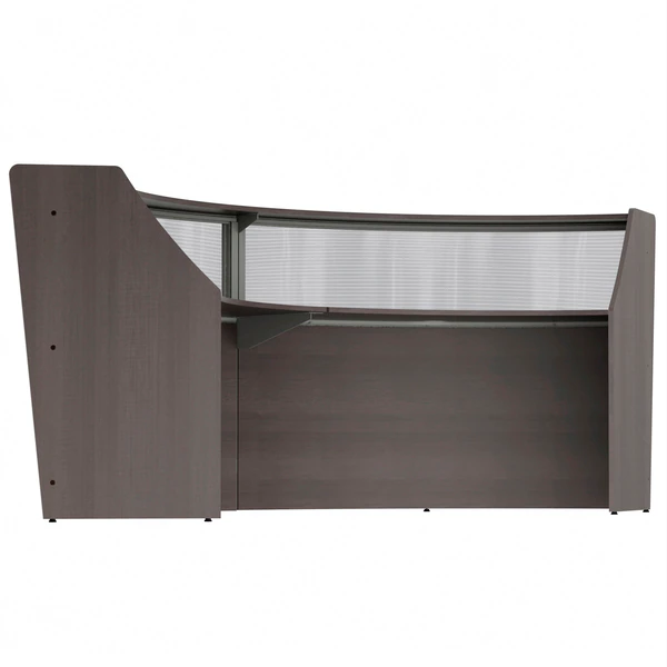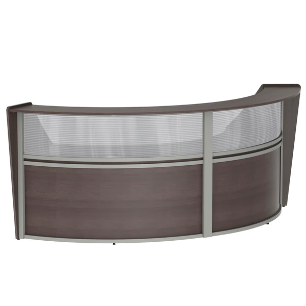 Linea Italia Curved Modern Reception Desk with Counter, 2 Units, Clear Panel that allows ligth into desk area. Dimensions: 124”W x 49”D x 46”H and 13"D in top counter and 20"D inside table. Strong metal frame and laminated wood body in Mocha finish. Reception Station modern design for Lobby, Salon, Office, Secretary, Receptionist. Easy to Assembly, no tools required, leveling glides for uneven flooring. Expertly shrink wrapped and packed to avoid damage during transit.