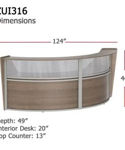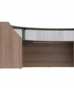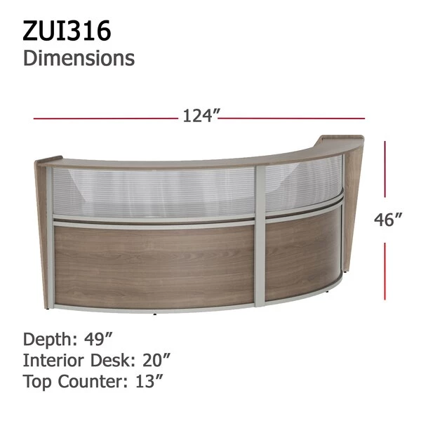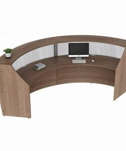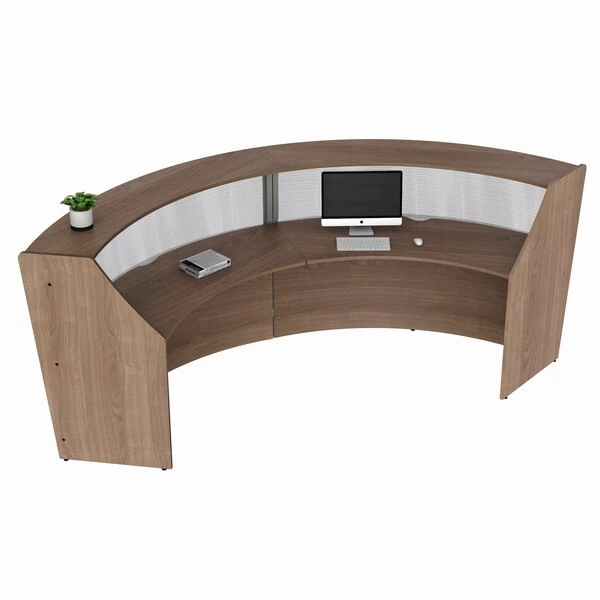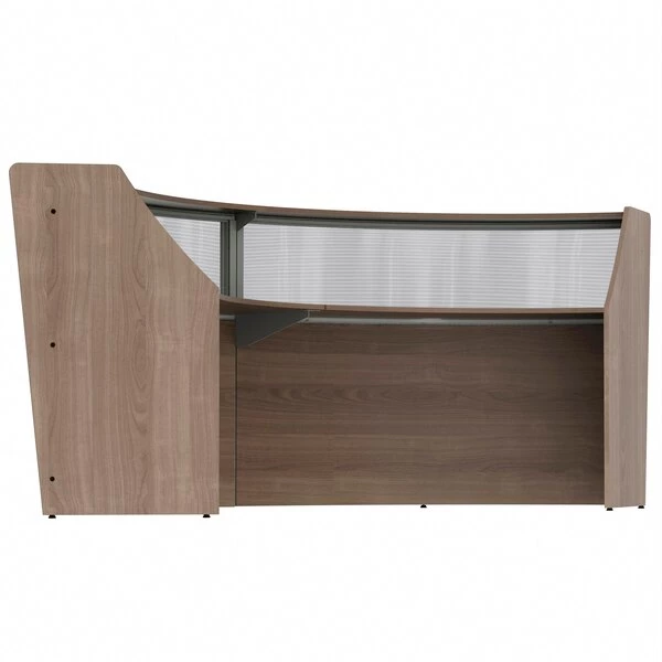 Linea Italia Curved Modern Reception Desk with Counter, 2 Units, Clear Panel that allows ligth into desk area. Dimensions: 124”W x 49”D x 46”H and 13"D in top counter and 20"D inside table. Strong metal frame and laminated wood body in Natural Walnut finish. Reception Station modern design for Lobby, Salon, Office, Secretary, Receptionist. Easy to Assembly, no tools required, leveling glides for uneven flooring. Expertly shrink wrapped and packed to avoid damage during transit.