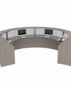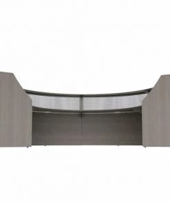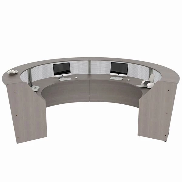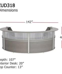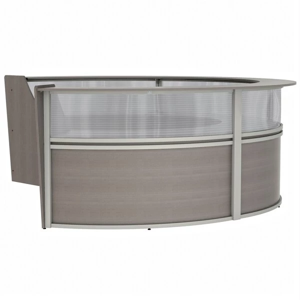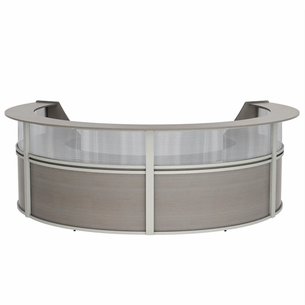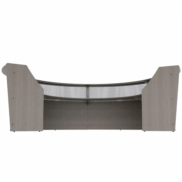 Linea Italia Curved Modern Reception Desk with Counter, 4 Units, Clear Panel that allows ligth into desk area. Dimensions: 142”W x 107"D x 46”H and 13"D in top counter and 20"D inside table. Strong metal frame and laminated wood body in Ash finish. Reception Station modern design for Lobby, Salon, Office, Secretary, Receptionist. Easy to Assembly, no tools required, leveling glides for uneven flooring. Expertly shrink wrapped and packed to avoid damage during transit.