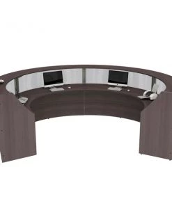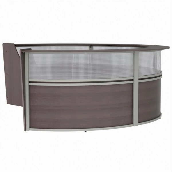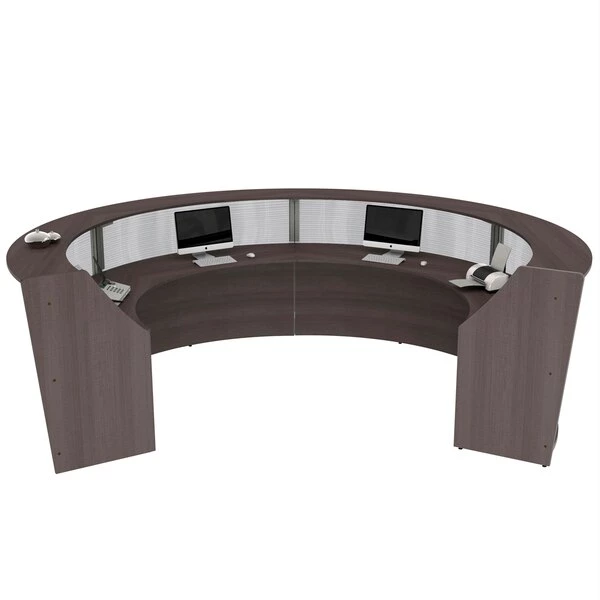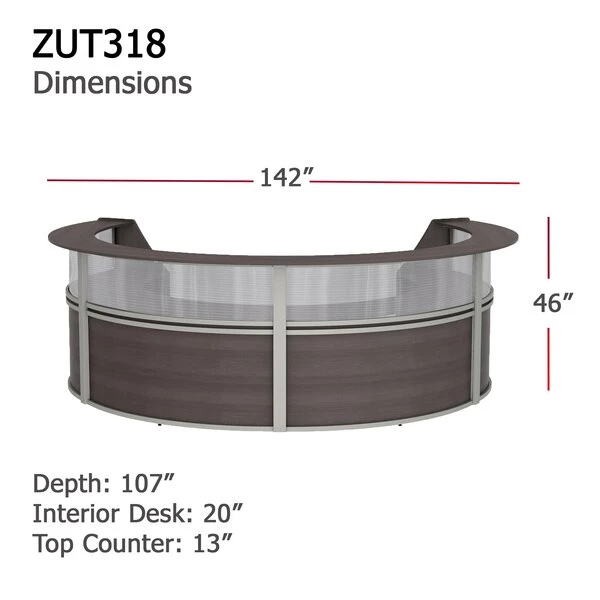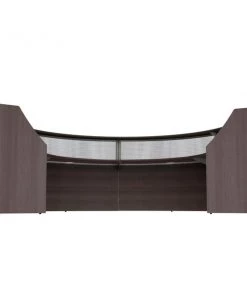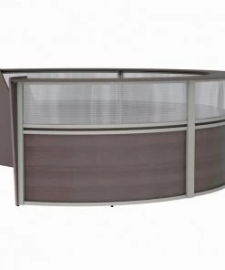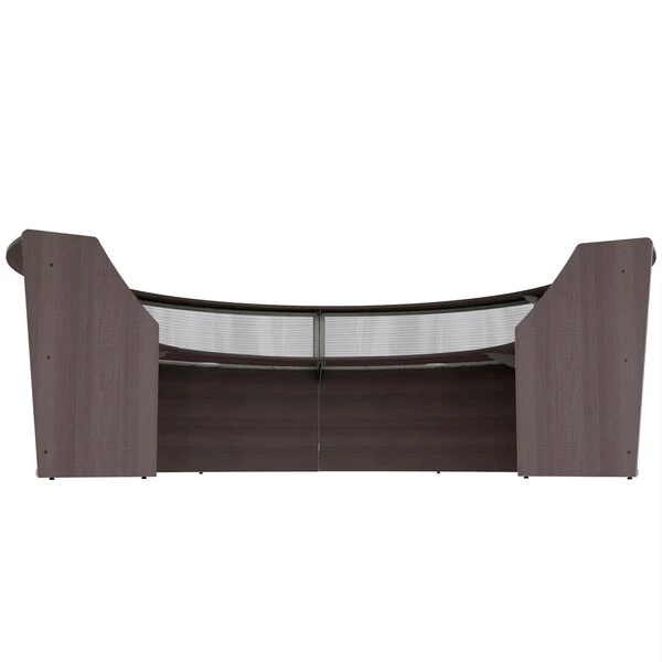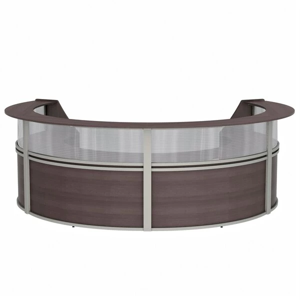Linea Italia Curved Modern Reception Desk with Counter, 4 Units, Clear Panel that allows ligth into desk area. Dimensions: 142”W x 107"D x 46”H and 13"D in top counter and 20"D inside table. Strong metal frame and laminated wood body in Mocha finish. Reception Station modern design for Lobby, Salon, Office, Secretary, Receptionist. Easy to Assembly, no tools required, leveling glides for uneven flooring. Expertly shrink wrapped and packed to avoid damage during transit.