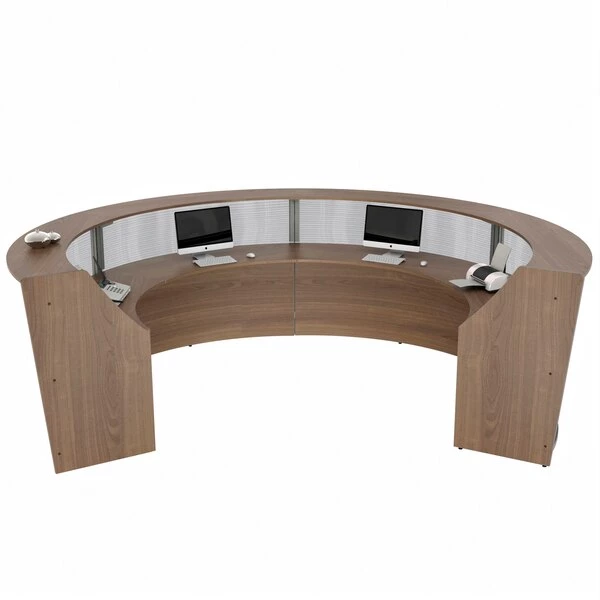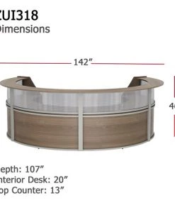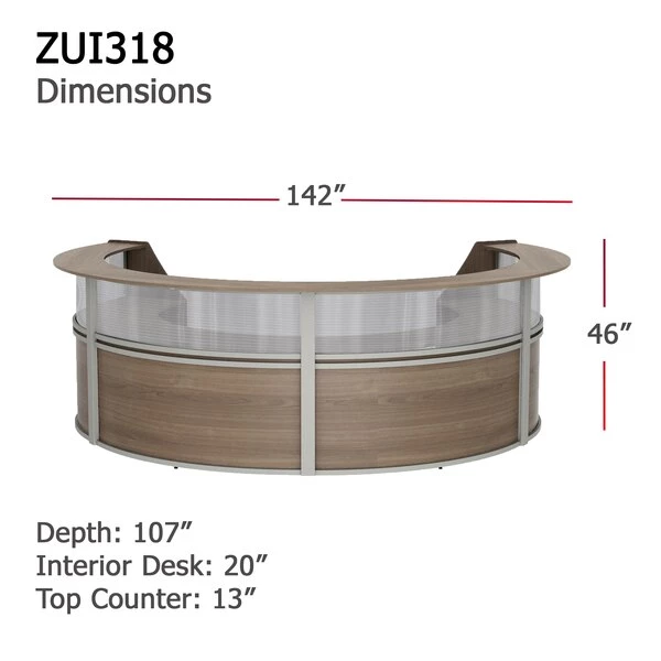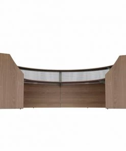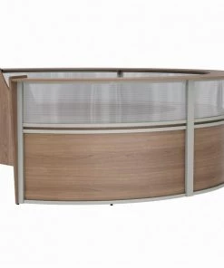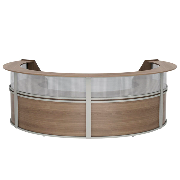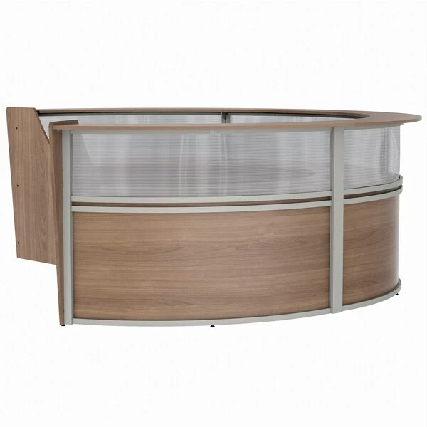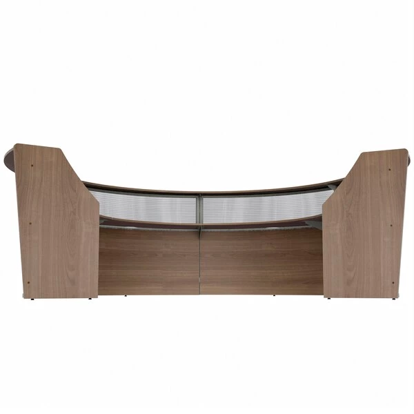 Linea Italia Curved Modern Reception Desk with Counter, 4 Units, Clear Panel that allows ligth into desk area. Dimensions: 142”W x 107"D x 46”H and 13"D in top counter and 20"D inside table. Strong metal frame and laminated wood body in Natural Walnut finish. Reception Station modern design for Lobby, Salon, Office, Secretary, Receptionist. Easy to Assembly, no tools required, leveling glides for uneven flooring. Expertly shrink wrapped and packed to avoid damage during transit.