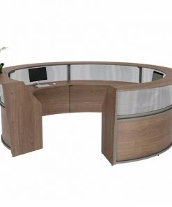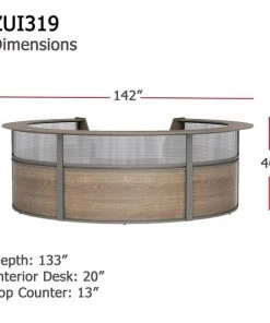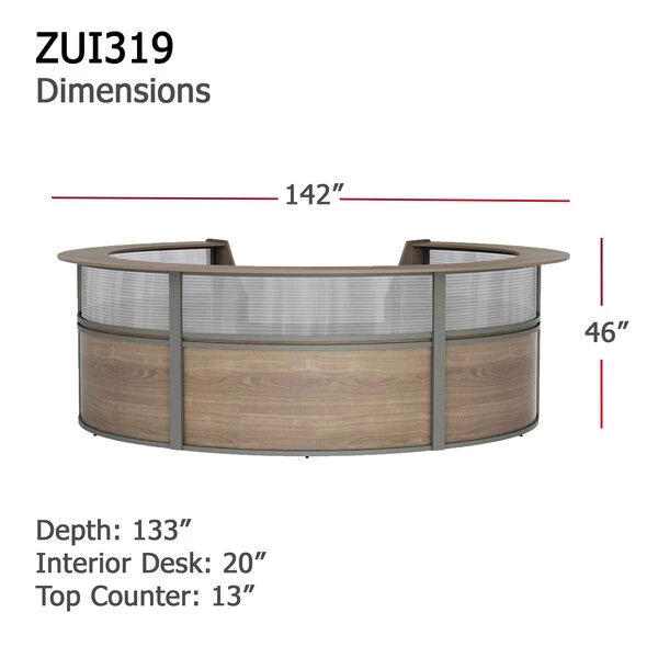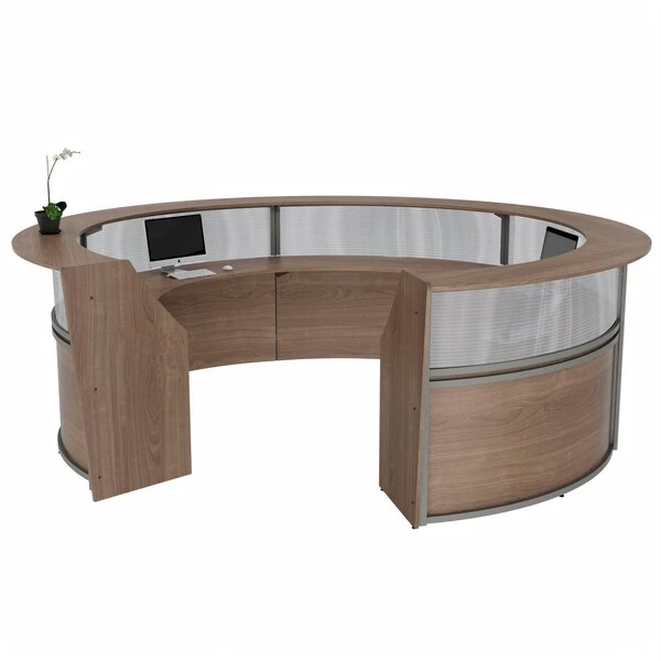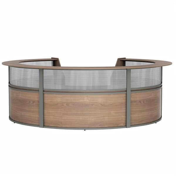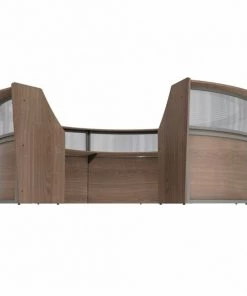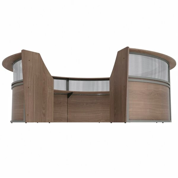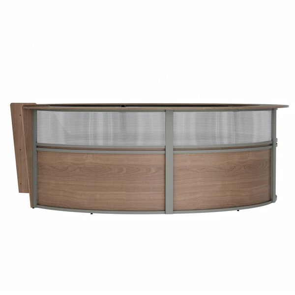 Linea Italia Curved Modern Reception Desk with Counter, 5 Units, Clear Panel that allows ligth into desk area. Dimensions: 142”W x 133"D x 46”H and 13"D in top counter and 20"D inside table. Strong metal frame and laminated wood body in Natural Walnut finish. Reception Station modern design for Lobby, Salon, Office, Secretary, Receptionist. Easy to Assembly, no tools required, leveling glides for uneven flooring. Expertly shrink wrapped and packed to avoid damage during transit.